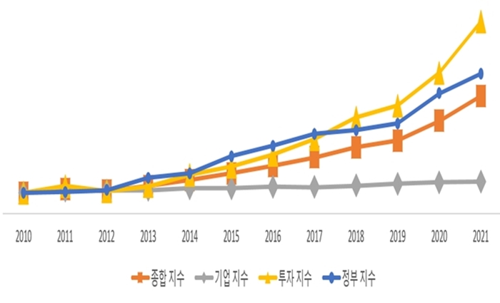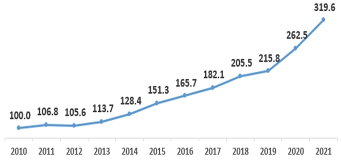’10년부터 도출된 지난 11년간 종합지수 값은 한 해(’12년)를 제외하고는 꾸준히 상승했으며, ’21년은 기준연도 대비약 3.2배 상승한 319.6을 기록했다.