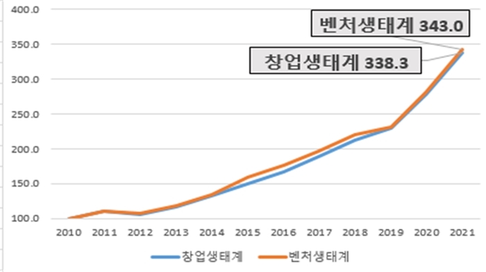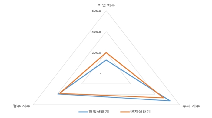 한편 창업 생태계와 벤처 생태계를 구분해 분석한 결과는 창업 생태계 지수는 338.3, 벤처 생태계 지수는 343.0으로 유사하게 나타났다.