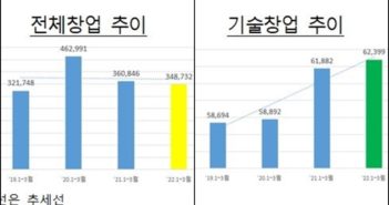 중소벤처기업부(장관 이영, 이하 중기부)는 2022년 1/4분기(1~3월) 창업기업 동향을 발표하며, 해당 기간 전체 창업은 348,732개로 나타났다고 밝혔다. 전체 창업은 전년동기대비 3.4%(12,114개) 감소*했으나, ‘20년도 이후 사업자등록이 급증한 부동산업을 제외할 경우 0.1%(162개) 증가했다. 특히 온라인․비대면화로 인해 정보통신업(9.6%), 교육서비스업(8.5%) 등에서 창업이 증가하면서 ‘기술기반업종 창업’(이하 ‘기술창업’)은 1/4분기(누적) 기준 6.2만개를 돌파했다. ◆ 업종별 동향 도·소매업은 온라인쇼핑 활성화 등에 힘입어 이번 분기도 0.7%가 증가하는 등 지속 증가하고 있다. 다만, ‘21년도 1/4분기 대폭 증가(‘20년 1분기 대비 ‘21년 1분기 26.3%↑)한 기저효과로 상승률은 크게 줄었다. 개인서비스업은 ’21년부터 증가세(‘20년 1분기 대비 ‘21년 1분기 4.1%↑)로 전환되었고, 이번 분기도 전년동기대비 2.2% 증가하는 등 증가세가 유지되고 있다. 반면 부동산업은 전전년도(’20년 1∼3월) 창업 급증에 따른 기저효과로 전년도에 이어 이번 분기도 전년동기대비 창업이 15.6% 감소했다. 숙박·음식점업은 올해 1분기 5.4% 감소하여 작년 동기대비(‘20년 1분기 대비 ‘21년 1분기 14.0%↓) 감소폭이 크게 줄었다. 기술창업은 소프트웨어개발공급업 등을 중심으로 한 정보통신업(9.6%)과 교육서비스업(8.5%)이 창업 증가를 주도하며 전년동기대비 0.8%(517개) 증가하는 등 작년 크게 증가(4.7%)한 이후 증가세를 유지하고 있다. 다만 기술창업 중 사업지원서비스업과 제조업은 전년동기대비 각각 8.7%, 7.4% 감소했다. ◆ 연령별 동향 전체 창업은 30대를 제외한 모든 연령대에서 감소하였으며, 기술창업의 경우에는 30대와 40대 연령대에서 증가했다. ◆ 조직형태별 동향 법인창업은 전년동기대비 2.5%(771개) 증가하였고, 개인창업은 3.9%(1만 2,885개) 감소하였다. 다만 부동산업을 제외할 경우, 법인창업은 전년동기대비 0.1%(24개) 감소하였고, 개인창업은 0.1%(186개) 증가한 것으로 나타났다. 법인창업은 금융보험업(23.0%↑), 전문·과학·기술업(20.1%↑), 부동산업(19.7%↑) 등의 업종에서 증가했지만, 건설업(17.9%↓), 개인서비스업(9.0%↓), 도·소매업(6.6%↓) 등의 업종에서 감소했다. 개인창업은 농·임·어업 및 광업(19.0%↑), 정보통신업(9.3%), 운수·창고업(9.0%↑) 등 업종에서 증가했지만, 부동산업(17.5%↓), 사업시설관리(7.2%↓), 숙박·음식점업(5.7%↓) 등 업종에서 감소했다. 기술창업의 경우는 법인은 6.7%(772개) 증가하였고, 개인은 0.5%(255개) 감소했다. ◆ 지역별 동향 지역별로는 충남(7.9%↑), 제주(0.4%↑), 인천(0.2%↑)지역은 창업이 증가하였고, 서울(8.9%↓), 대전(7.1%↓) 등 나머지 지역에서 감소했다. 다만 부동산업을 제외 시 세종(7.3%↑), 인천(6.6%↑), 경기(2.3%↑), 강원(2.0%↑), 부산(1.0%↑), 광주(1.0%↑), 경북(0.9%↑), 제주(0.7%↑) 지역(8개)에서 증가했으나, 서울(4.1%↓), 대전(2.8%↓), 충남(2.6%↓), 울산(2.2%↓), 전남(1.4%↓), 경남(1.2%↓), 전북(1.1%↓), 충북(0.3%↓) 지역(8개)에서는 감소했다. 관련기사더보기 https://www.venturesquare.net/855533
