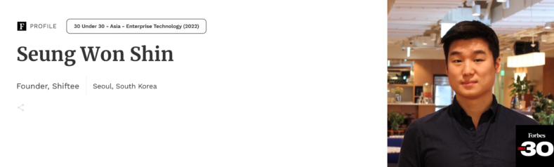 통합 인력관리 솔루션 ‘시프티(Shiftee)’를 운영하고 있는 신승원 대표가 지난 27일 미국 포브스지가 선정한 ‘30세 이하 아시아 리더 30인(30 under 30 Asia list 2022)’에 이름을 올렸다.