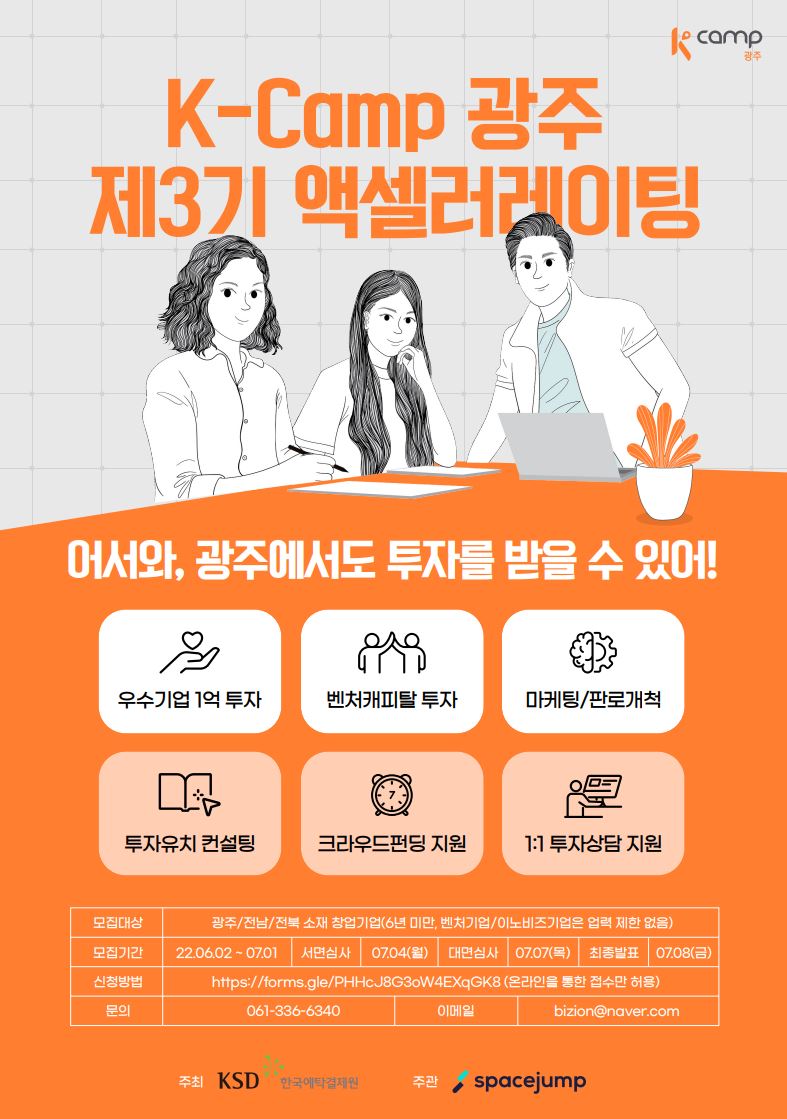 한국예탁결제원 광주지원은 K-Camp 광주 제3기 프로그램 운영을 위해 스타트업 액셀러레이터인 ‘스페이스점프’를 파트너사로 선정했다. 광주·전남·전북에 소재한 6년 미만(벤처기업, 이노비즈기업은 업력에 무관)의 기술 기반 스타트업들은 본 프로그램에 지원할 수 있다.