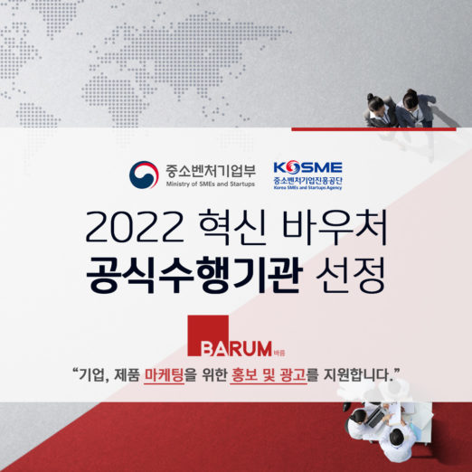 주식회사 바름(대표 장진훈)은 중소벤처기업부/중소벤처기업진흥공단 주관 ‘2022 중소기업 혁신바우처사업(일반 바우처)’ 수행기업으로 선정되었으며, 성장 가능성 있는 전국 중소기업의 마케팅을 위한 홍보 및 광고 서비스 지원에 나선다.