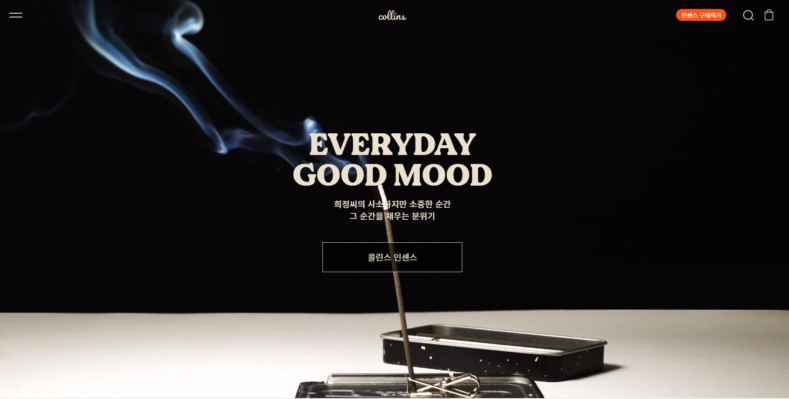 한편 고객과의 또다른 접점인 사이트에 들어가도 콜린스만의 톤앤매너가 명확하다는 것을 느낄 수 있다. ‘OO씨의 사소하지만 소중한 순간을 채우는 분위기’라는 슬로건과 함께 인센스 스틱을 제안하기도 하고, 소비자에게 “OO씨에게 ‘하찮은 순간’ 같은건 없어요. 이 시간과 공간을 좋은 분위기로 채워보세요”, ‘좋아하는 것들로 채워졌을 때, OO씨의 순간은 ‘분위기’로 기억될 거예요”, “언제든, 어디서든 좋은 분위기를 즐길 여유 정도는 챙겨두기로 해요”라는 메시지들을 던진다. 이것이 바로 콜린스가 소비자에게 콜린스의 스토리를 전하는 방식이자 곧 콜린스만의 아이덴티티가 되었고 고객들은 자발적으로 콜린스 리뷰를 인스타그램 피드에 올리고 지인들한테 선물하는 등 눈으로 보이는 콘텐츠 뿐만 아니라 버벌 효과까지 일으키게 된 것이다.