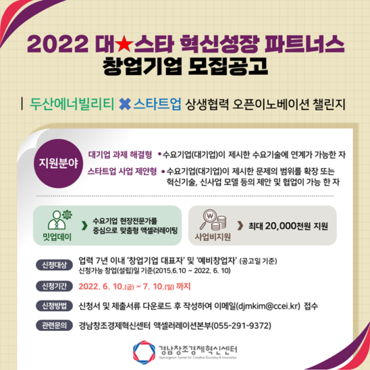경남창조경제혁신센터와 두산에너빌리티(舊 두산중공업)는 2022년 ‘2022 대-스타 혁신성장 파트너스’ 참여 기업을 공개 모집한다고 밝혔다.