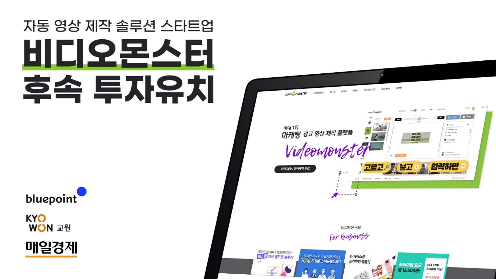 자동 영상 제작 솔루션 제공 기업 ‘비디오몬스터‘가 후속 투자유치를 했다고 10일 밝혔다. 이번 투자에는 테크 기반 액셀러레이터인 블루포인트파트너스가 참여했고 전략적 투자자로 교원그룹과 매경미디어그룹의 미라클랩이 참여했다. 비디오몬스터는 금번 후속 투자를 포함해서, 시리즈 A 투자를 완료하게 되었다.