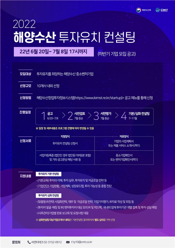 본 프로그램은 해양수산부가 주최하고 해양수산과학기술진흥원이 주관하며, 씨엔티테크가 운영하는 사업이다. 이번 프로그램의 선정대상은 투자유치를 희망하는 ‘해양수산 분야’의 중소벤처 기업으로서 지원규모는 10개사 내외이다