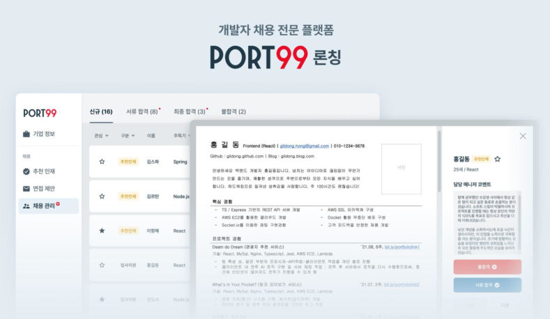 Port99는 복잡한 절차 없이 개발 직군의 지원자를 간편하게 관리하고 면접 일정을 조율할 수 있는 채용 플랫폼이다. 개발자들의 이력서를 별도 다운로드 없이 개발 직무 및 기술 스택 별로 간편하게 조회하는 것은 물론, 여러 명의 구직자에게 한 번에 면접을 제안할 수도 있다.