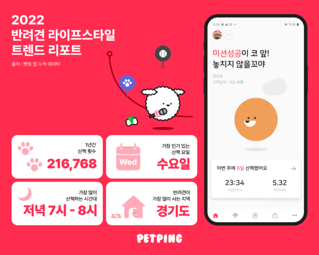 스몰티켓(대표 김정은)이 출시한 펫 디지털 헬스케어 앱 펫핑이 출시 1년만에 누적 10만 다운로드를 기념하며 ‘2022 반려견 라이프스타일 트렌드 리포트’ 를 지난 30일 발표했다. 이번 리포트는 지난 1년간 누적된 펫핑 앱의 이용 데이터를 분석하여 펫 케어시장의 트렌드를 다각도에서 진단했다.
