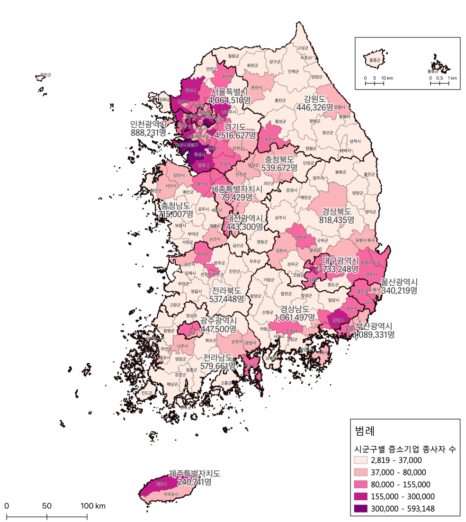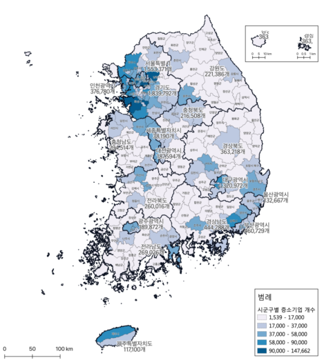 수도권(서울·인천·경기) 쏠림 현상은 전년 대비 다소 심화됐다. 수도권 소재 중소기업 수는 376만 9,943개로 전체 기업의 51.7%를 차지하면서 전년 대비 0.4%p 증가했다.수도권 소재 중소기업 종사자도 946만 9,368명으로 전체 기업의 54.0%를 차지하며 전년 대비 0.3%p 증가했으며, 매출액도 1,560조 5,395억 원으로 전체 기업의 58.4%를 차지하며 전년 대비 0.3%p 증가한 것으로 나타났다. - 조직형태별