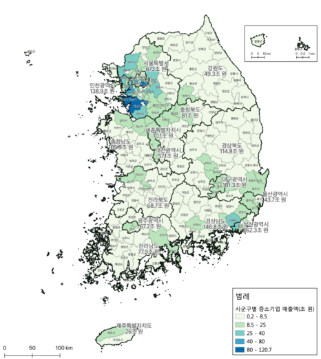 매출액 기준으로는 도·소매업 918조 4,883억 원(비중 34.4%, 0.7%p↑), 제조업 683조 8,759억 원(비중 25.6%, 1.3%p↓), 건설업 299조 2,900억 원(비중 11.2%, 0.2%p↓) 순으로 높은 것으로 나타났다.전년 대비 비중이 증가한 업종은 도·소매업(0.7%p↑), 부동산업(0.5%p↑), 전문·과학·기술서비스업(0.3%p↑) 등이 있고, 제조업(1.3%p↓), 숙박·음식점업(0.2%p↓), 건설업(0.2%p↓) 등은 매출액 비중이 감소했다. - 지역별