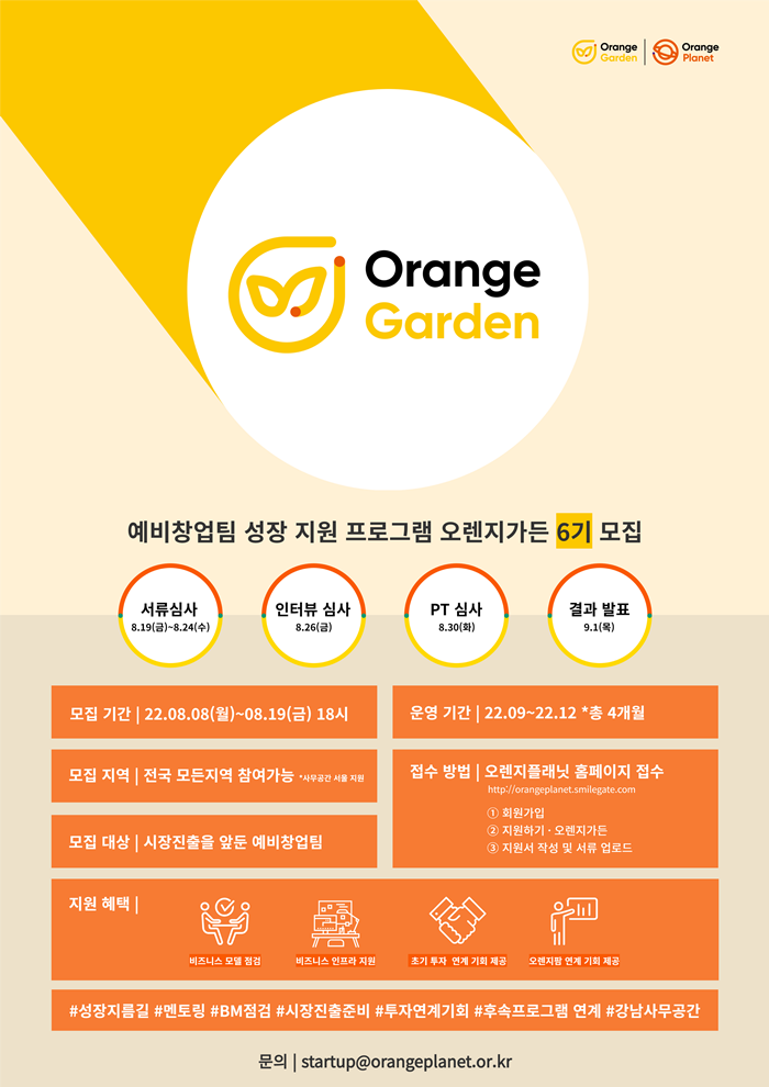 오렌지플래닛 관계자는 “본 프로그램을 통해, 예비창업팀들이 창업을 준비하는 과정에서 비즈니스 모델 및 사업전략을 수립하는 데 큰 도움을 받을 수 있을 것으로 기대한다”며 “오렌지가든과 함께할 예비창업팀들이 비즈니스 로드맵을 세세히 점검하고, 추후 시장 진출에 성공할 수 있도록 다방면으로 지원할 계획”이라고 말했다.