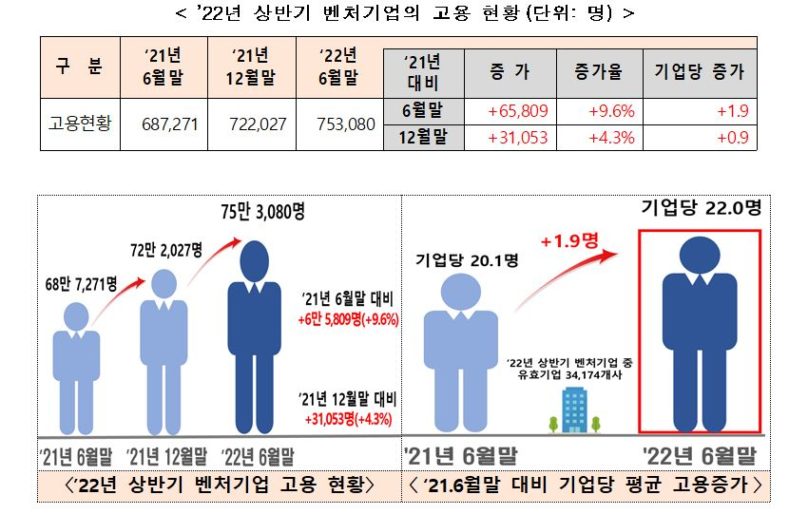 - 전체:벤처기업 3만 4,174개사 ’22년 6월 말 고용 75만 3,080명,’21년 6월 말 대비 6만 5,809명 증가