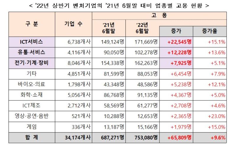정보통신기술(ICT)서비스, 유통‧서비스의 경우엔 정보통신기술(ICT) 기반의 플랫폼 기업들 중심으로 전기·기계·장비의 경우는 반도체, 2차전지 장비·부품 제조 벤처기업들 중심으로 고용이 늘었다.