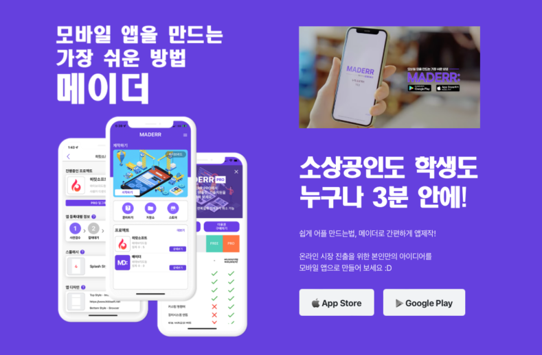 메이더는 소스코딩 없이 10가지 내외 간단한 정보만 입력하면 3분 안에 무료로 iOS, Android 모바일 앱을 제작해주는 노코드(No Code) 플랫폼이다.