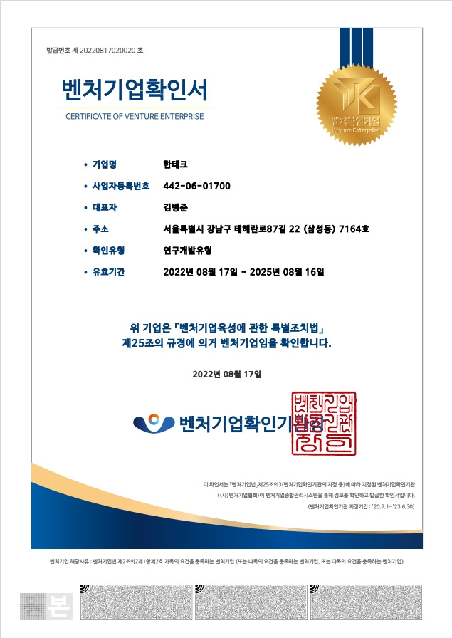 Edge AI System으로 안전한 스마트시티를 만들어가고 있는 한테크가 연구개발유형 벤처기업 인증을 획득했다.