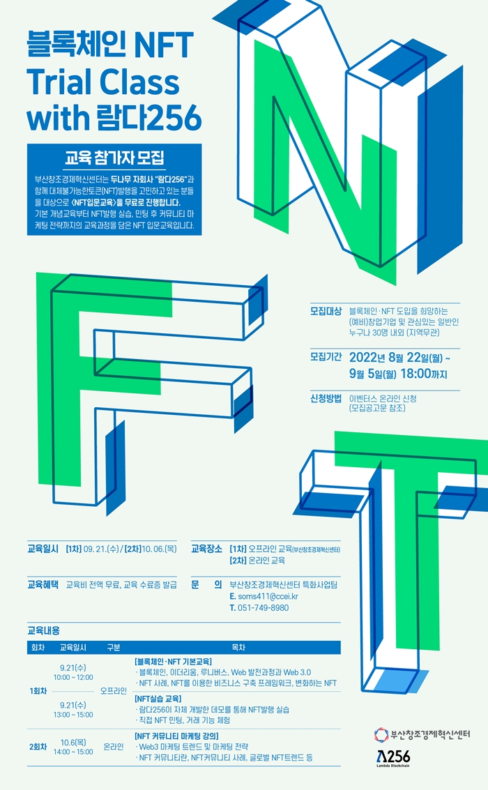 부산창조경제혁신센터(센터장 송용준, 이하 부산창조센터)는 NFT 입문교육인 ‘블록체인 NFT Trial Class with 람다256’ 에 참여할 교육생을 오는 9월 5일까지 2주간 모집한다고 22일 밝혔다.