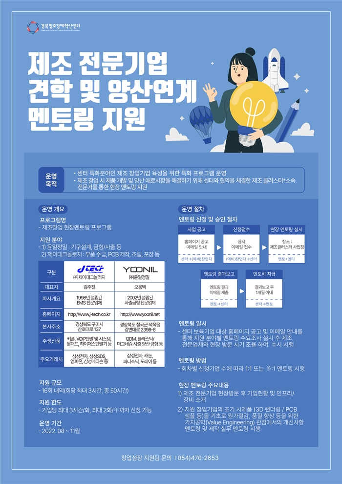 ‘제조 전문기업 견학 및 양산연계 멘토링 지원프로그램’은 지역의 제조혁신 생태계 구축 및 제조클러스터 운영을 위해 센터와 협약을 체결한 제조 전문 중소기업인 제이테크놀러지(주), ㈜윤일정밀과 함께 진행한다.