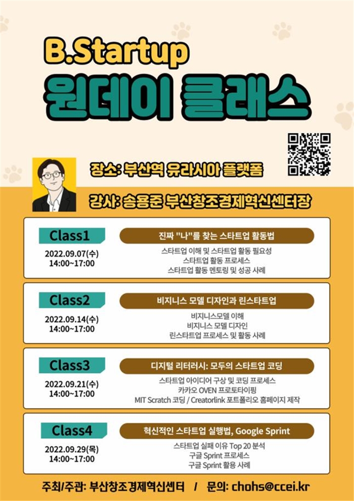 원데이클래스는 매주 수요일 2시 부산역에 위치한 유라시아플랫폼에서 진행되며, 신청은 이벤터스 또는 부산센터 홈페이지를 통해 스타트업과 창업에 관심있는 누구나 신청 가능하다.