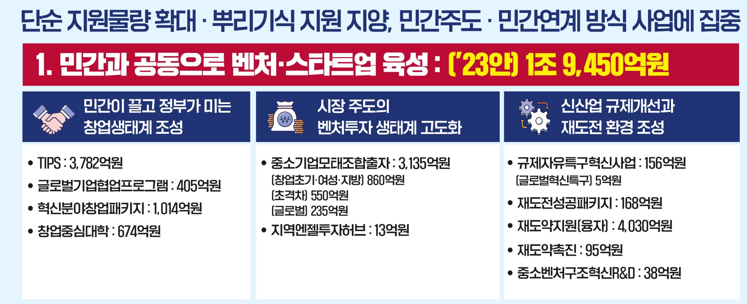 첫째, 민간 중심 역동경제 기조에 맞게 민간주도 또는 민간연계 방식의 창업 지원 예산을 증액하여 성과를 극대화하고, 시장 주도의 벤처투자 생태계 고도화로 혁신 벤처·스타트업의 글로벌 시장 진출을 촉진한다.