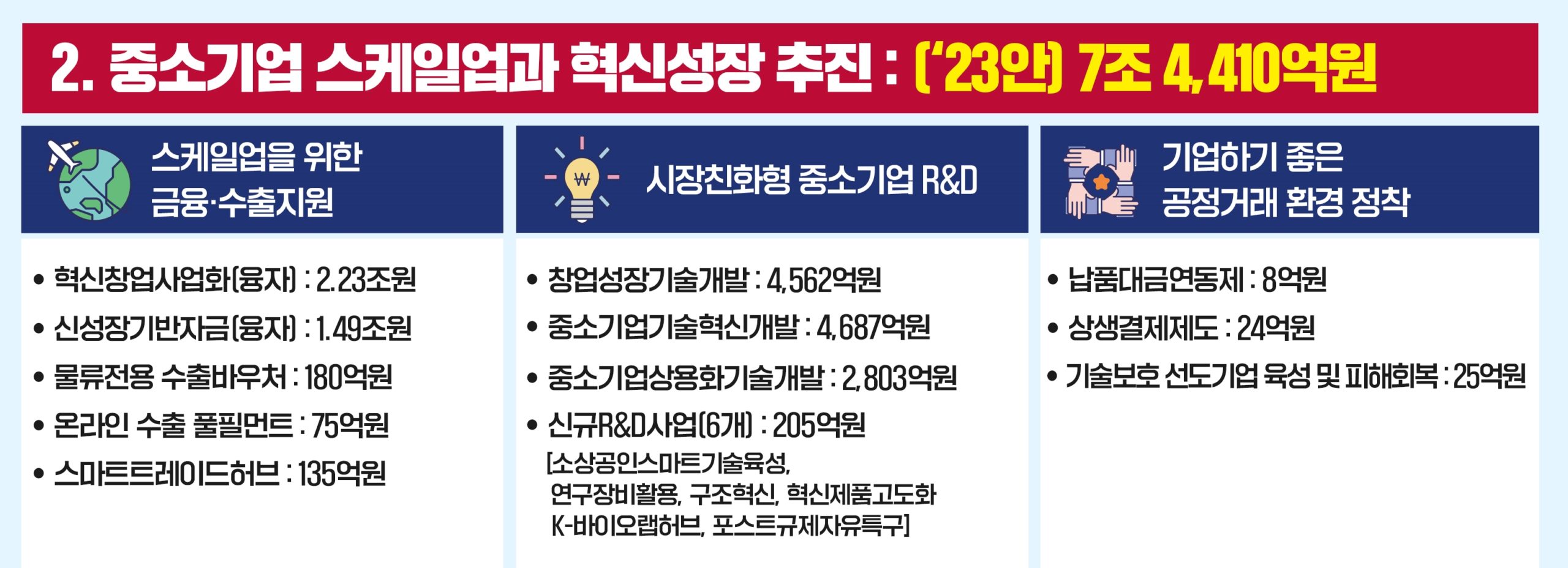 2023년도 예산안은 고금리·고환율·고물가 3고(高) 위기 등 불확실한 경제 상황에서 ‘중소·벤처기업이 중심에 서는 민간 중심의 역동적 경제’라는 기본 방향하에 3대 중점투자 방향(▲민간과 공동으로 벤처‧스타트업 육성 ▲중소기업 스케일업과 혁신성장 정책 추진 ▲소상공인·자영업자의 완전한 회복과 새로운 도약)을 설정하고 예산을 편성했다.