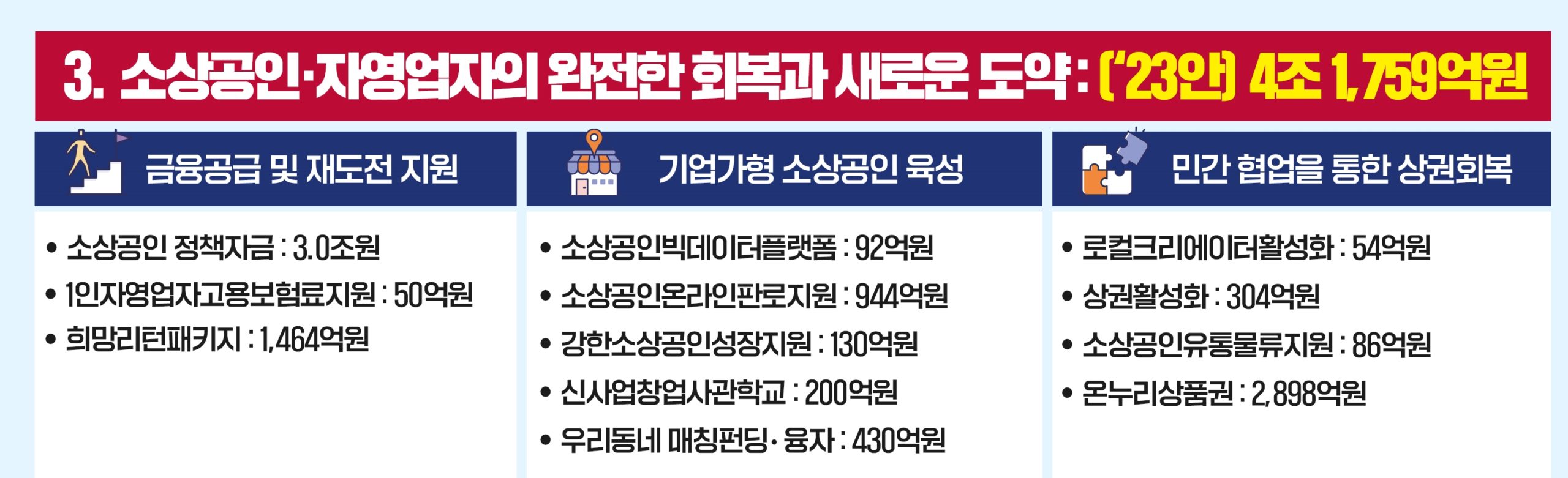 코로나19・3高 충격에 대응하여 소상공인・자영업자가 코로나19 이전 수준으로 회복할 수 있도록 돕는다.