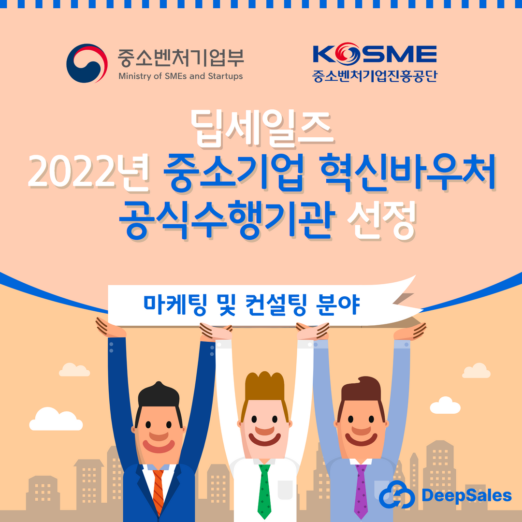 해외 바이어 발굴 인공지능 솔루션 전문기업 딥세일즈(대표 김진성)가 중소벤처기업부와 중소벤처기업진흥공단이 주관하는 ‘2022 중소기업 혁신바우처 사업’의 마케팅과 컨설팅분야 수행기업으로 선정됐다고 지난 30일 밝혔다.