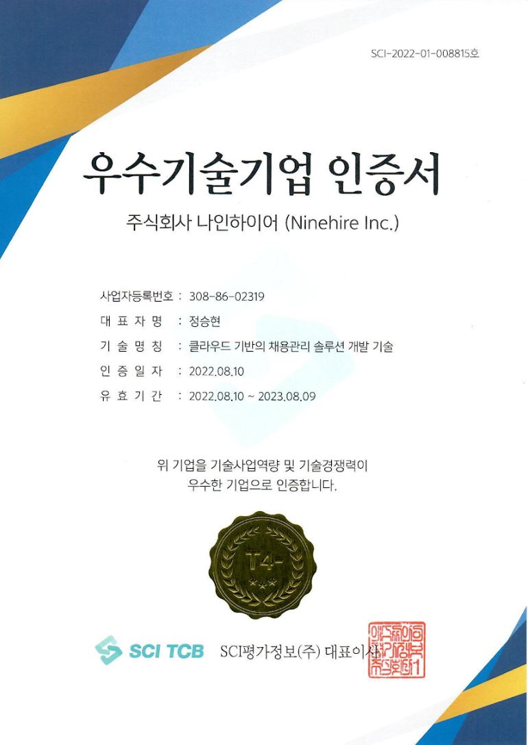 채용관리 솔루션 나인하이어가 기술신용평가(TCB) 전문기관인 SCI평가정보로부터 상위기술기업에 부여되는 ‘T4-등급’을 획득했다고 발표했다.