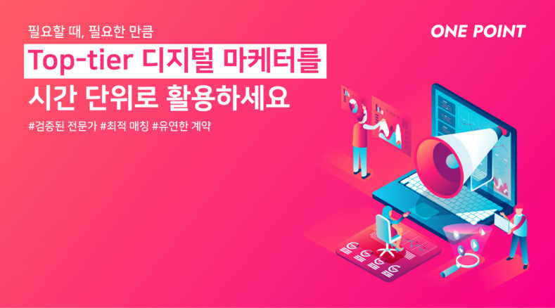 원포인트는 스타트업과 온라인 판매자(셀러)가 실력 있는 디지털 마케팅 전문가를 시간 단위로 유연하게 활용할 수 있도록 전문가를 검증하고 기업에 매칭 해주는 플랫폼이다. 원포인트의 인재풀은 유명 스타트업, 디지털 마케팅 에이전시, 빅테크, 대기업 전현직 출신의 실무 역량이 뛰어나고 산업 이해도가 높은 전문가들이 포진해 있다. 고객사는 간단한 서비스 신청만으로 평균 1주일 이내에 최적의 전문가를 추천받을 수 있고, 합리적인 비용으로 실력 있는 전문가를 활용할 수 있다.