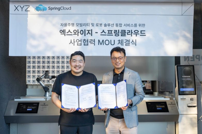 서비스 로봇 스타트업 엑스와이지(대표 황성재)가 자율주행 모빌리티 솔루션 전문기업 스프링클라우드(대표 송영기)와 자율주행 모빌리티 및 로봇 솔루션 통합 서비스를 위한 MOU를 체결했다고 8일 밝혔다.