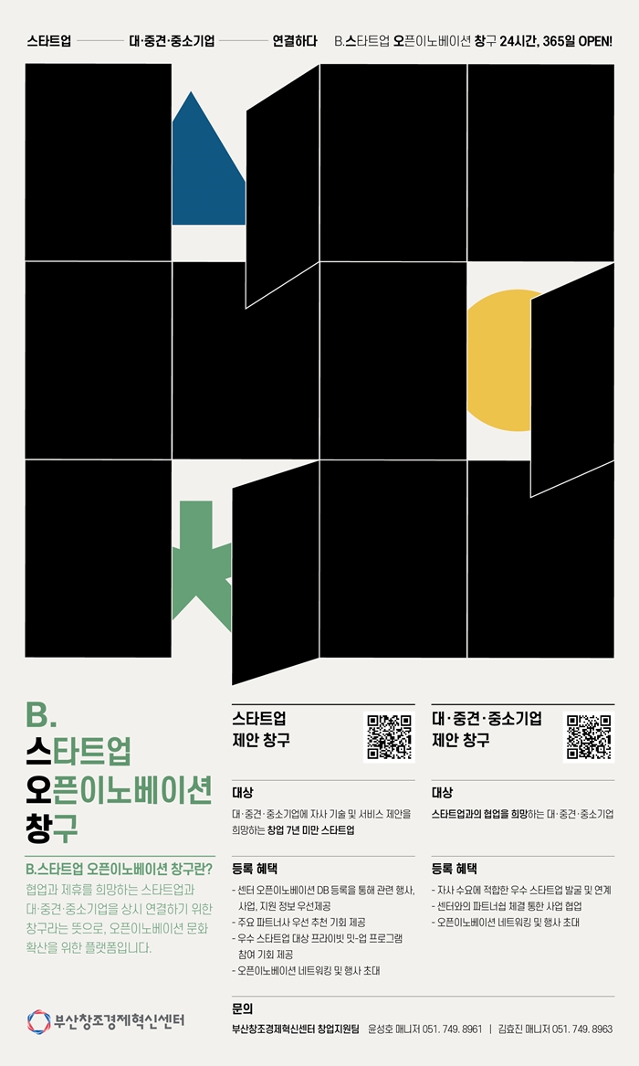 ‘B.스타트업 오픈이노베이션 창구’를 통해 스타트업은 대기업 및 중견기업에게 자사의 서비스와 협업 의사를 알릴 수 있고, 대기업 및 중견기업은 현장 수요에 적합한 스타트업을 물색할 수 있도록 양쪽의 수요를 모아 연결하는 플랫폼 역할을 해나갈 예정이다.