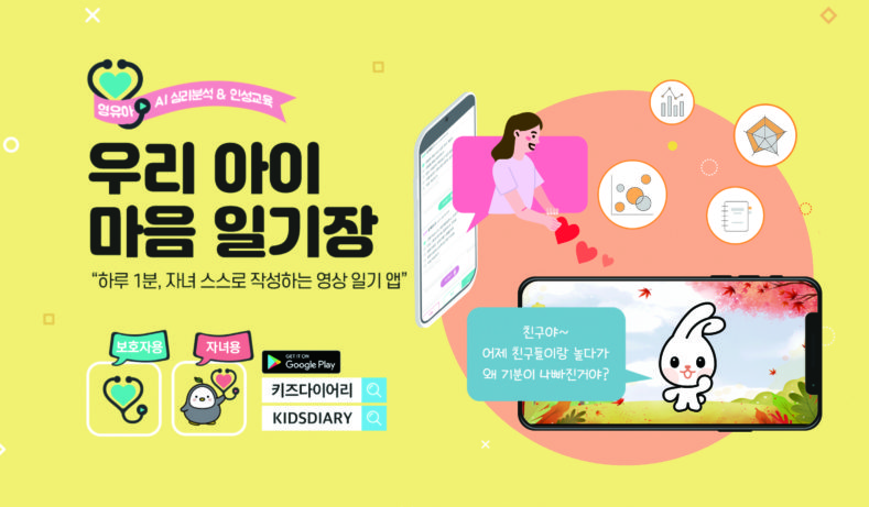 ‘키즈다이어리’는 자녀의 영상일기에서 감정 데이터를 추출하고, 심리 및 감정분석 결과에 따라 비대면으로 심리 상담 및 인성교육 서비스를 제공하는 앱이다. 자녀는 영상일기를 통해 자신의 감정을 이야기하며 케어받을 수 있고, 보호자는 분석 결과를 통해 자녀의 감정 상태를 확인하고, 육아 가이드를 조언받을 수 있다.