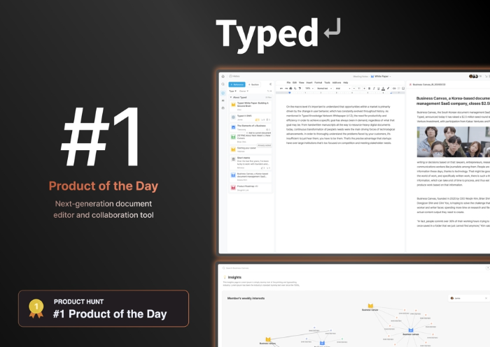 디지털전환(Digital Transformation, DX)을 선도하는 스타트업 비즈니스캔버스(대표 김우진)의 차세대 문서 협업툴 타입드(Typed)가 글로벌 소프트웨어 빌보드차트로 알려진 미국 커뮤니티 플랫폼 ‘프로덕트 헌트(Product Hunt)’에서 ‘오늘의 제품(Product of the Day)’ 1위에 선정됐다.