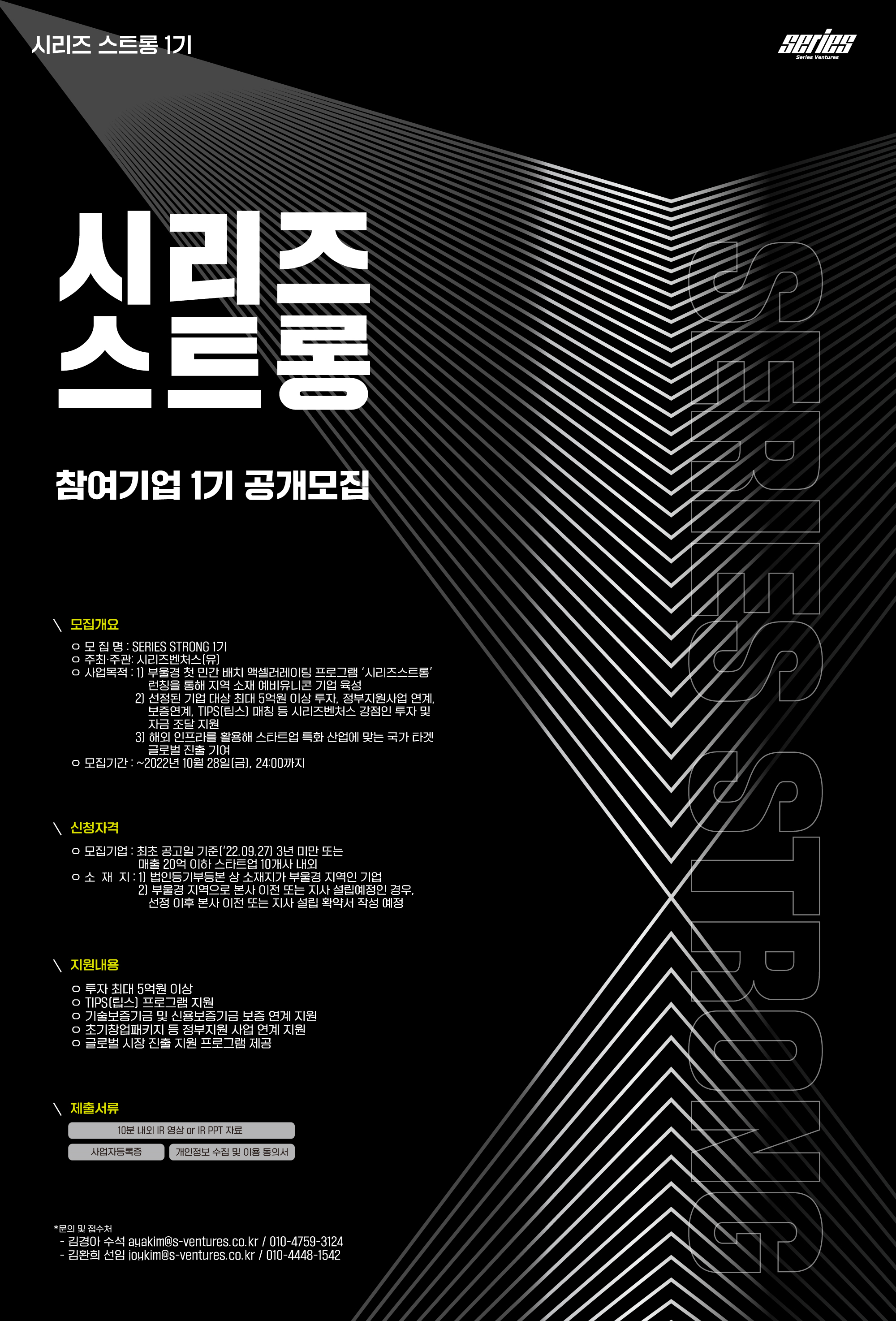 사업 고도화를 위한 실질적인 성장 지원 프로그램을 제공하는 ‘시리즈스트롱 1기’는 10월 28일(금)까지 참여 스타트업을 모집하며. ‘10분 내외 IR 영상’ 또는 ‘IR PPT 자료’ 및 기타 구비서류 제출 이후 11월부터 선정 절차가 이루어진다.