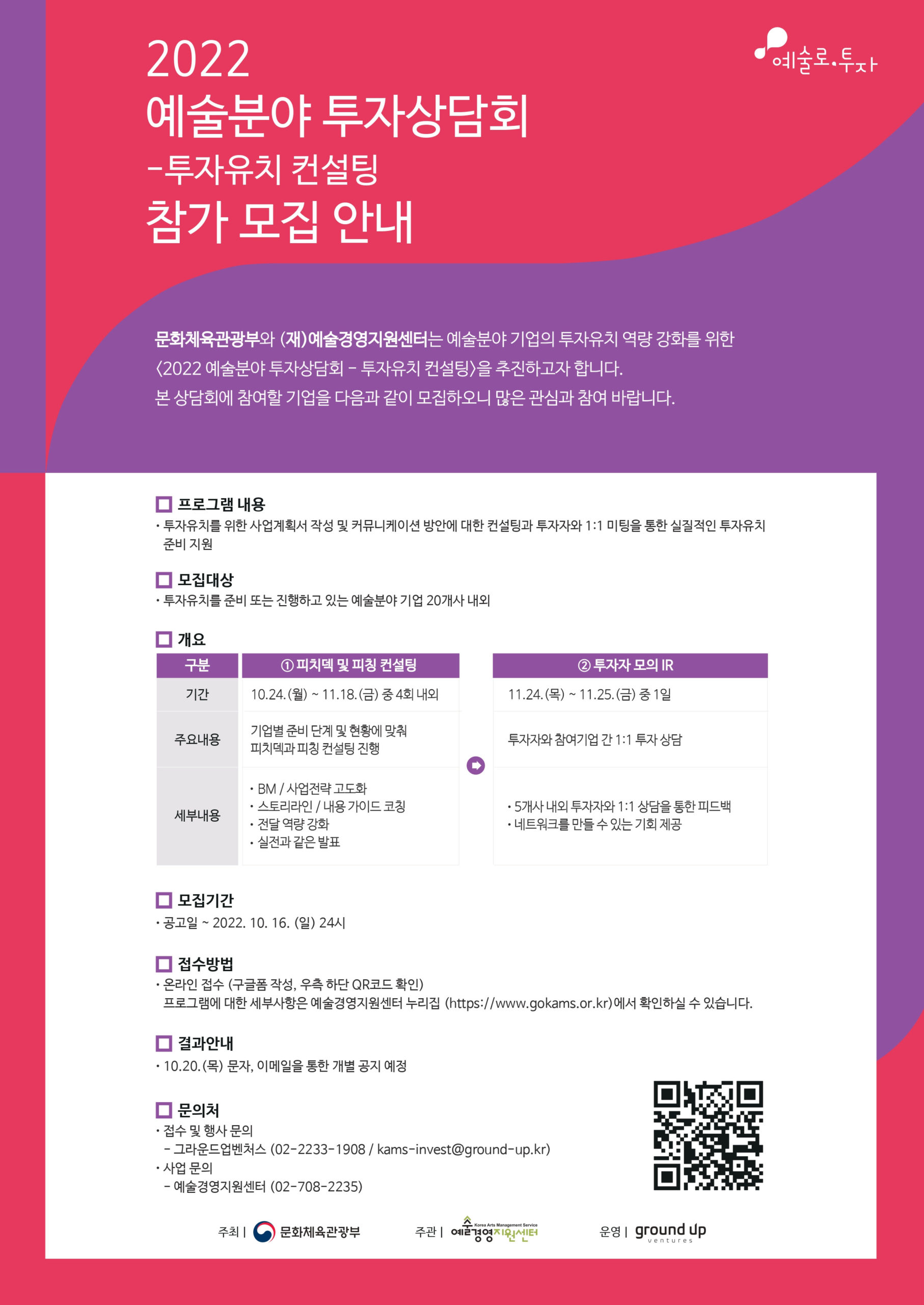 문화체육관광부와 예술경영지원센터는 2022 예술분야 투자상담회-투자유치 컨설팅(이하 투자유치 컨설팅)에 참여할 기업을 16일 까지 모집한다고 4일 밝혔다.