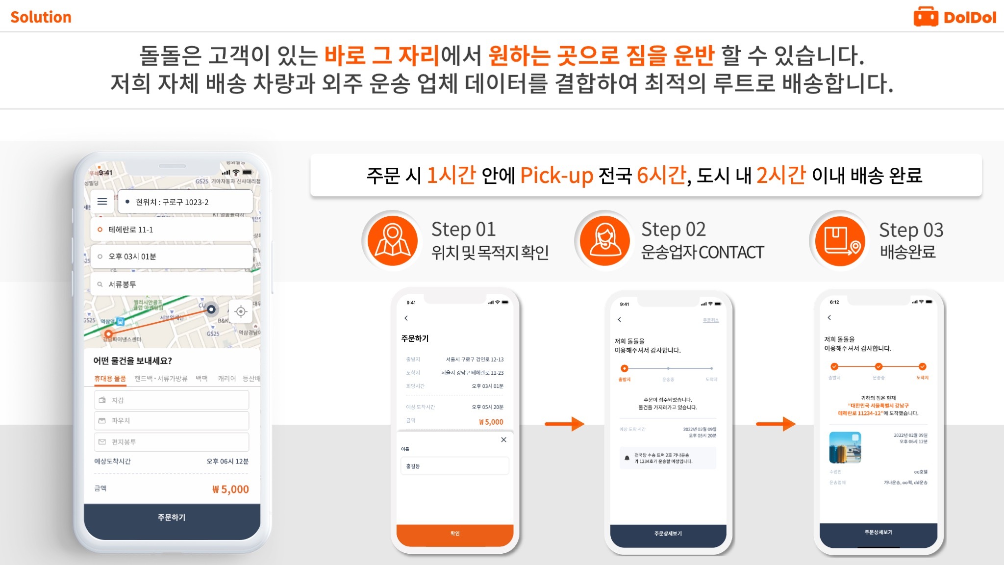 DolDol 서비스는 4~11km 배송 시장이 여전히 퀵서비스나 소규모 봉고차 등을 이용한 옛날 운송 방식으로 남아있다는 점에 착안해 이 시장의 디지털 전환을 시도하고 있다. 서비스 출시 이후 투자 유치와 9개 정부지원사업 선정 등을 통해 시장 가능성을 입증해 나가고 있다.