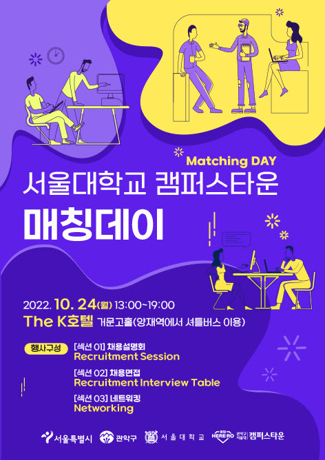 2022 서울대학교 캠퍼스타운 매칭데이가 오는 24일 더케이호텔에서 열린다. 이번 행사는 관악구청과 서울대학교 캠퍼스타운이 주관하는 채용 행사로, 스타트업 13개사(엘핀, 피터페터, 노트하우, 맵시, 엘로이랩, 바이오고, 펫나우, 에니아이, 블루시그넘, 일만백만, 소테리아, 테이텀, 공공)가 참여하여 구직자들을 만날 예정이다.
