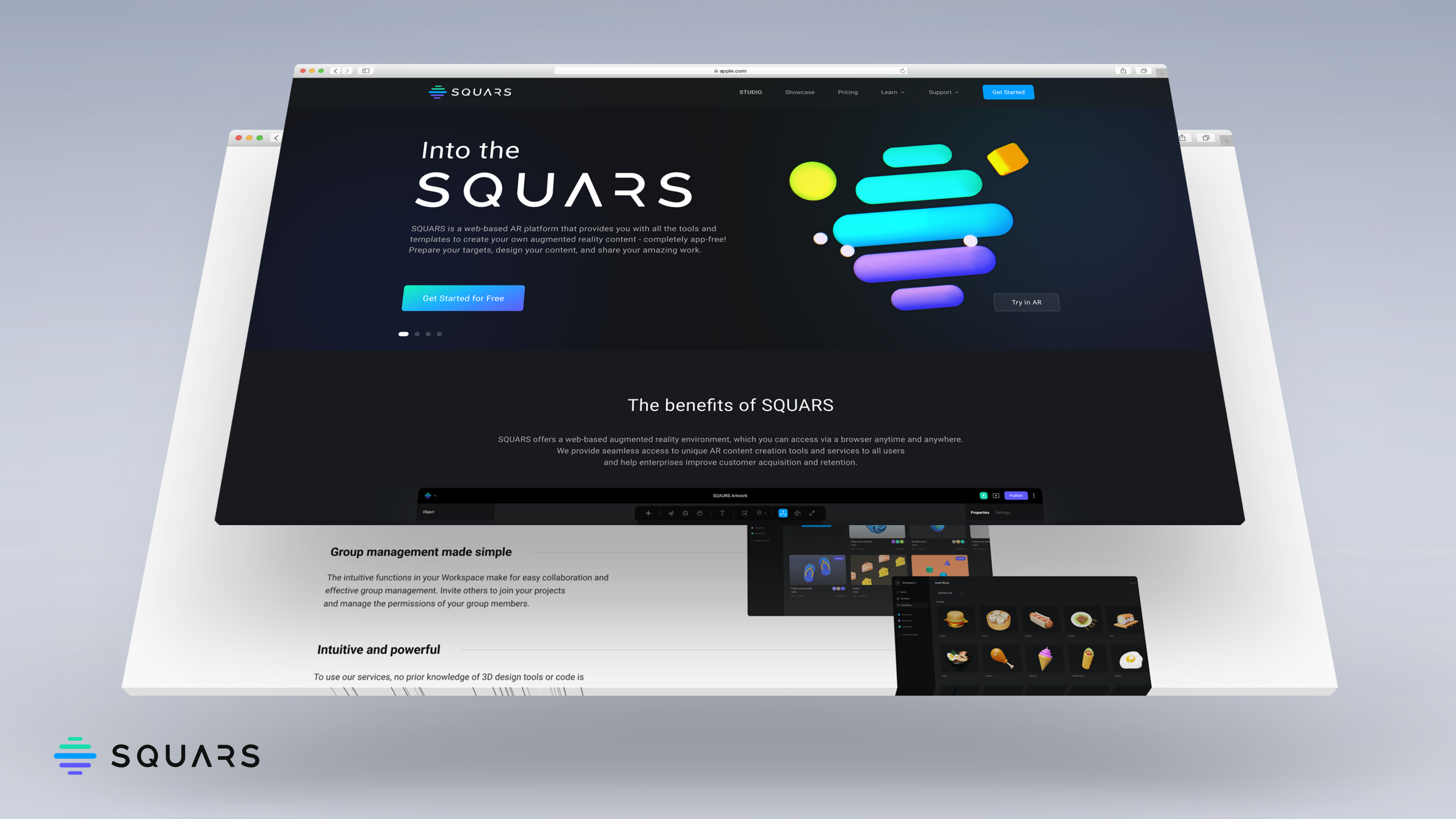 스퀘어스는 웹에서 몇 번의 마우스 클릭만으로 AR콘텐츠 저작, 관리, 배포, 공유, 경험, 비즈니스 활용까지 가능한 올인원(All-in-one) 플랫폼으로, 기존의 AR콘텐츠 저작 및 사용시 겪었던 번거로움과 시간 소모를 최소화할 수 있다. 또한 번거롭게 별도의 저작 도구 앱을 설치할 필요가 없다. 개발지식이 없어도 누구나 사용할 수 있는 노코드(No-Code) 방식으로 크롬 등 웹브라우저 환경에서 AR콘텐츠 저작부터 상품 구매 웹페이지를 연결하는 기능 등을 통한 비즈니스 활용까지 가능하다.