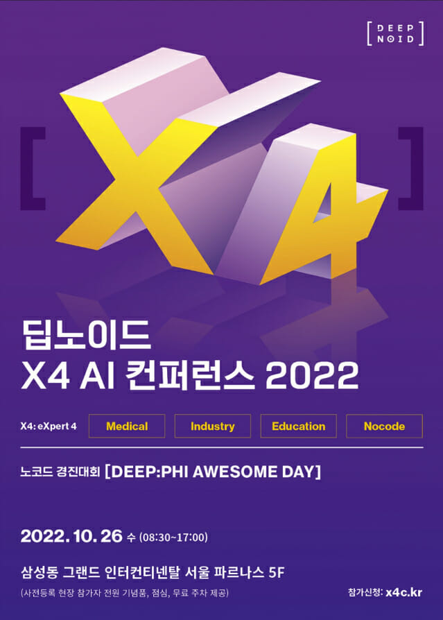 인공지능(AI) 플랫폼 전문기업 딥노이드는 오는 26일 삼성동 그랜드 인터컨티넨탈 서울 파르나스에서 최신 의료 인공지능(AI)와 산업AI기술 트렌드 4개 사업분야(X4: 의료, 산업, 교육, 노코드) 혁신사례 등을 발표하는 ‘X4 AI 컨퍼런스2022’를 개최한다.