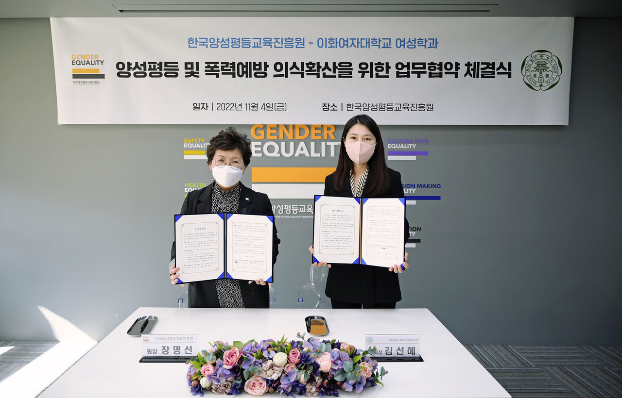 양성평등 문화 확산·폭력예방 의식 제고 등을 위해 한국양성평등교육진흥원과 이화여자대학교 여성학과가 상호 업무협약을 4일 체결했다.
