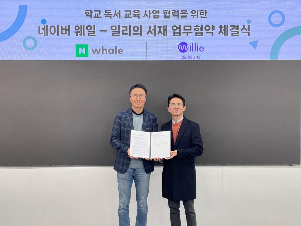 독서 플랫폼 밀리의 서재가 ‘에듀테크 플랫폼을 활용한 학교 독서교육 활성화 목적’을 위해 네이버 웨일과 손잡는다. 밀리의 서재는 8일 네이버 웨일과 협약식을 진행했으며, 양사는 해당 협약식에서 독서 접근성을 높이는 에듀테크 환경을 위한 협업 방향성을 논의했다.
