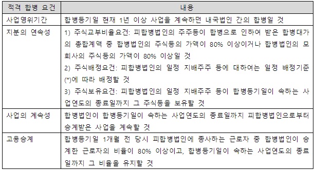 먼저 적격합병이란, 다음의 요건을 모두 만족하는 합병으로, 세무상 피합병법인의 사업활동이 합병법인에 승계되어 그대로 유지되는 형식적인 조직개편에 불과하다고 보아 취득세를 제외하고는 관련 세부담이 발생하지 않는다.