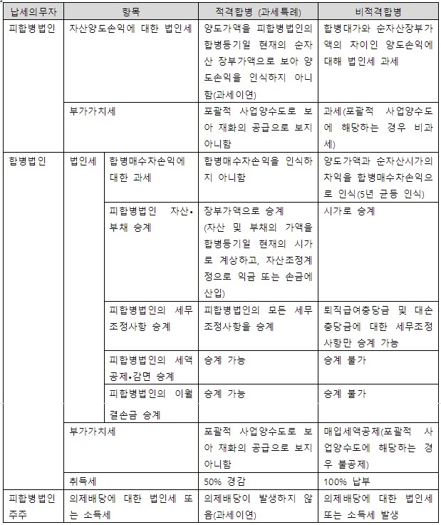 적격합병과 비적격합병에 따른 납세의무자별 세부담의 차이를 간단히 정리하면 다음과 같다.