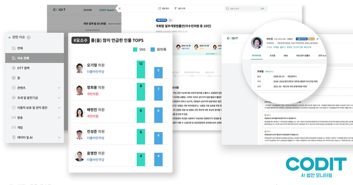 또한 코딧은 AI 법안 모니터링 외 국회 의원, 정부 부처 관계자, 협회 등 다양한 이해관계자의 정보와 발언을 한번에 확인하고 관리할 수 있는 서비스도 제공한다.
