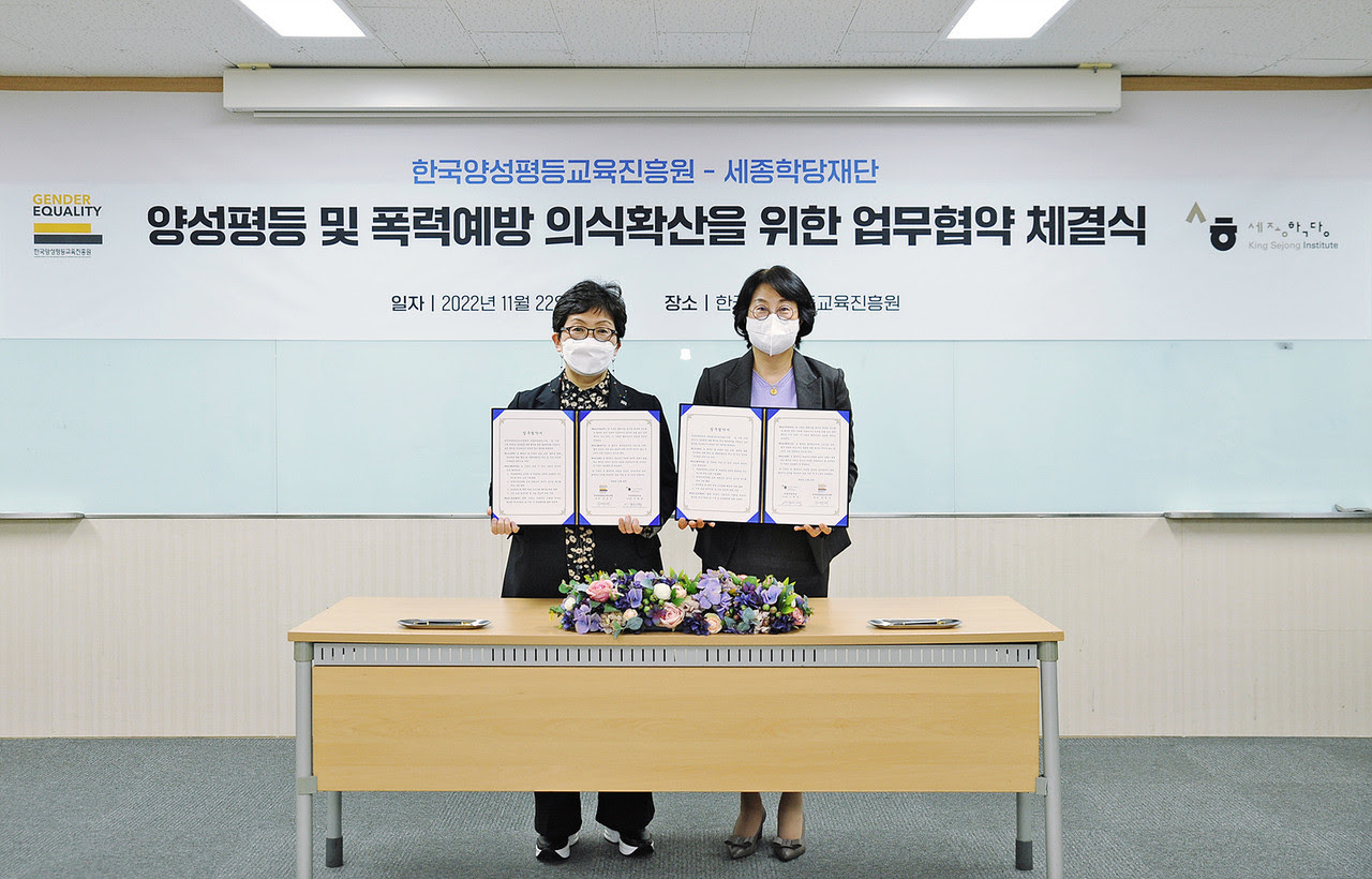 여성가족부 산하 한국양성평등교육진흥원이 세종학당재단과 양성평등 문화 확산을 위한 MOU를 22일 체결했다.