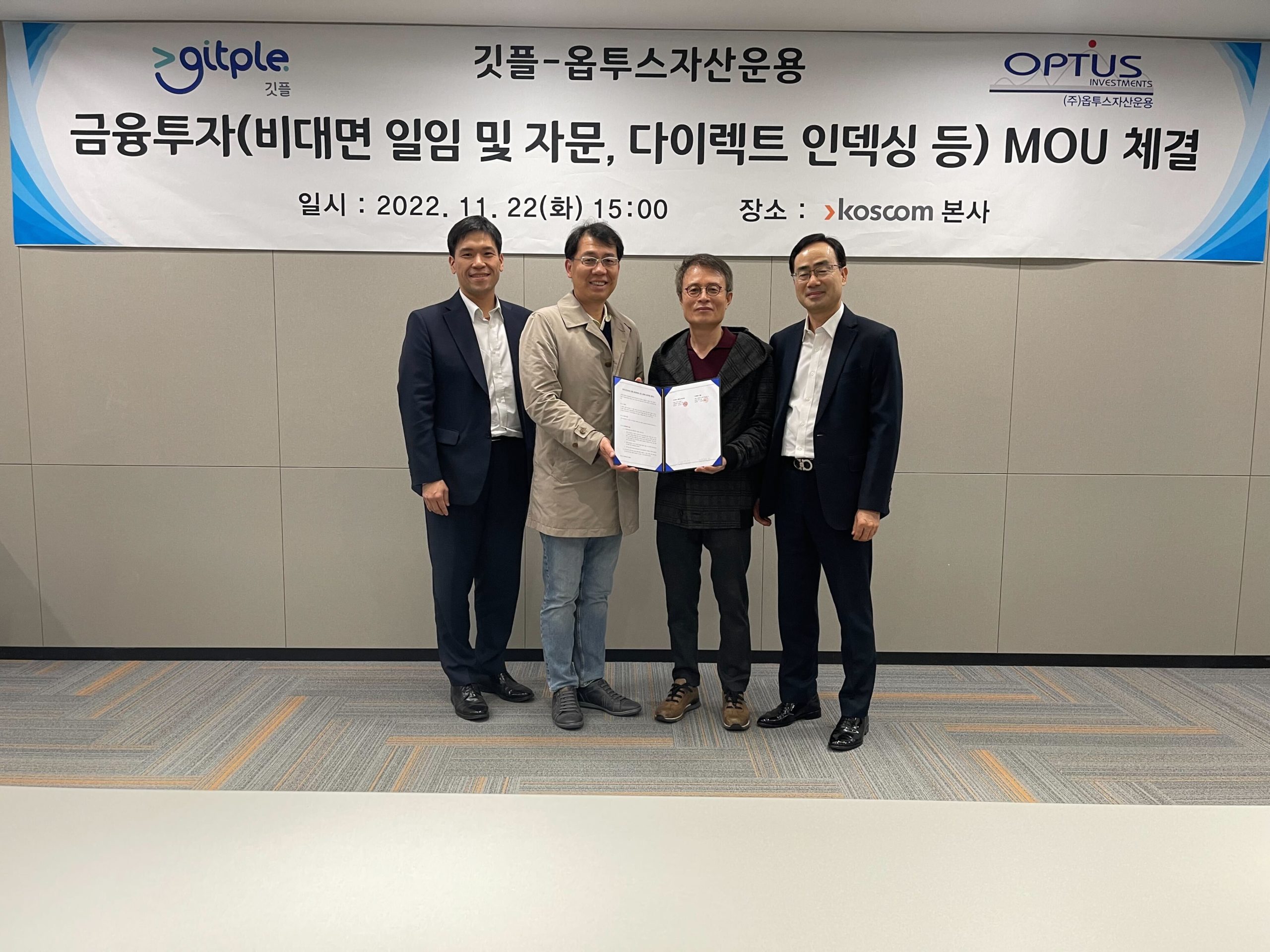 ‘베러’ 운영사 깃플이 ‘퀀트·알고리즘 기반 주식 포트폴리오 운용 명가’ 옵투스자산운용과 협업하기로 했다. 양사는 업무협약을 체결하고, 본 협약을 통해 향후 금융투자서비스 사업인 ▲비대면일임 ▲비대면자문 ▲다이렉트 인덱싱(Direct Indexing) 등을 공동으로 추진할 예정이다.
