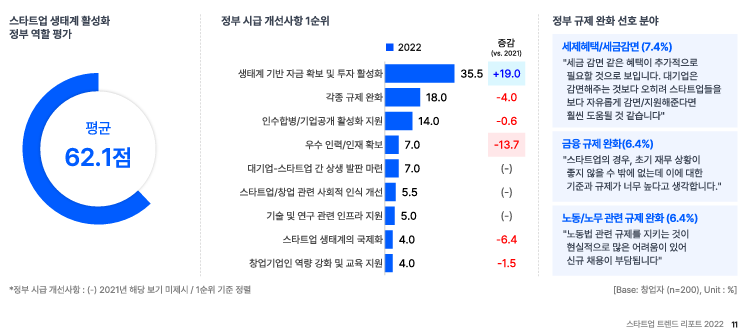 정부 역할 평가는 62.1점으로 작년(69점)보다 감소했다. 시리즈 A 투자를 받은 스타트업 창업자는 상대적으로 정부 역할에 높은 평가를 줬다. 가장 적극적인 정부기관으로는 창업진흥원(24.0%)과 서울산업진흥원(15.0%), 창조경제혁신센터(14.5%)가 상위 3위권을 유지했다. (1순위 응답 기준). 창업자들은 세제혜택/세금감면(7.4%), 금융 규제(6.4%), 노동/노무 관련 규제(6.4%)을 완화가 시급한 정부 규제로 꼽았다.