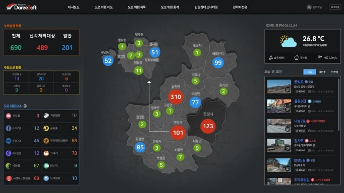 한편 다리소프트의 핵심 서비스인 AI 기반 실시간 도로위험정보 서비스 ‘RiaaS’는 AI 모델이 탑재된 인공지능 도로 분석장치를 통해 시속 100km 주행 중에도 실시간으로 도로 파임(포트홀), 도로 균열, 노면 표시 불량, 낙하물과 쓰레기, 로드킬, 운전자의 시선을 방해하는 현수막 등 총 12가지 도로 위험요소를 탐지하며, 졸음방지 센서, 응급콜 등의 운전자 보조 기능을 포함하고 있다. 이를 통해 탐지된 위험정보는 클라우드 기반 서버에서 2차 정밀 분석 후 관제 시스템으로 전송되고, 실시간으로 공유된 도로 위험정보는 위험요소 발생 경고 및 도로 유지보수 등에 활용된다.