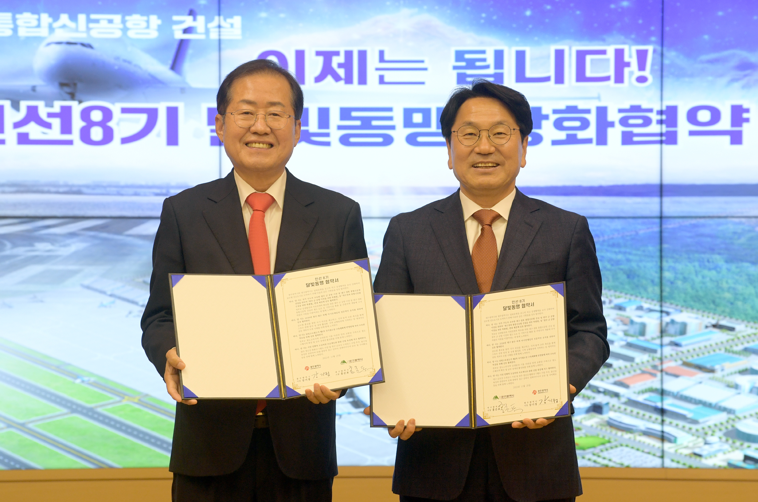 이날 협약에서 양 시는 지역 최대 염원인 ▲광주 군 공항 이전 및 대구‧경북 통합신공항 건설 ▲달빛고속철도 조기 착공 ▲역사와 생태, 꿀잼이 살아나는 시민친화적 도심하천 프로젝트 ▲2038 광주‧대구 하계 아시안게임 성공 유치 등에 적극 협력하기로 했다.