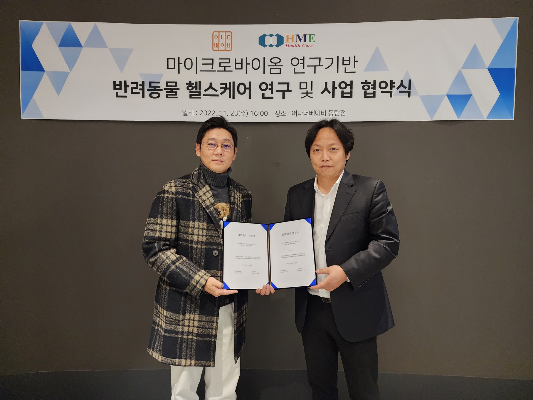 ‘어나더베이비’가 HME헬스케어와 마이크로바이옴 기반 반려동물 헬스케어 연구사업 진행을 위한 업무협약을 체결했다.