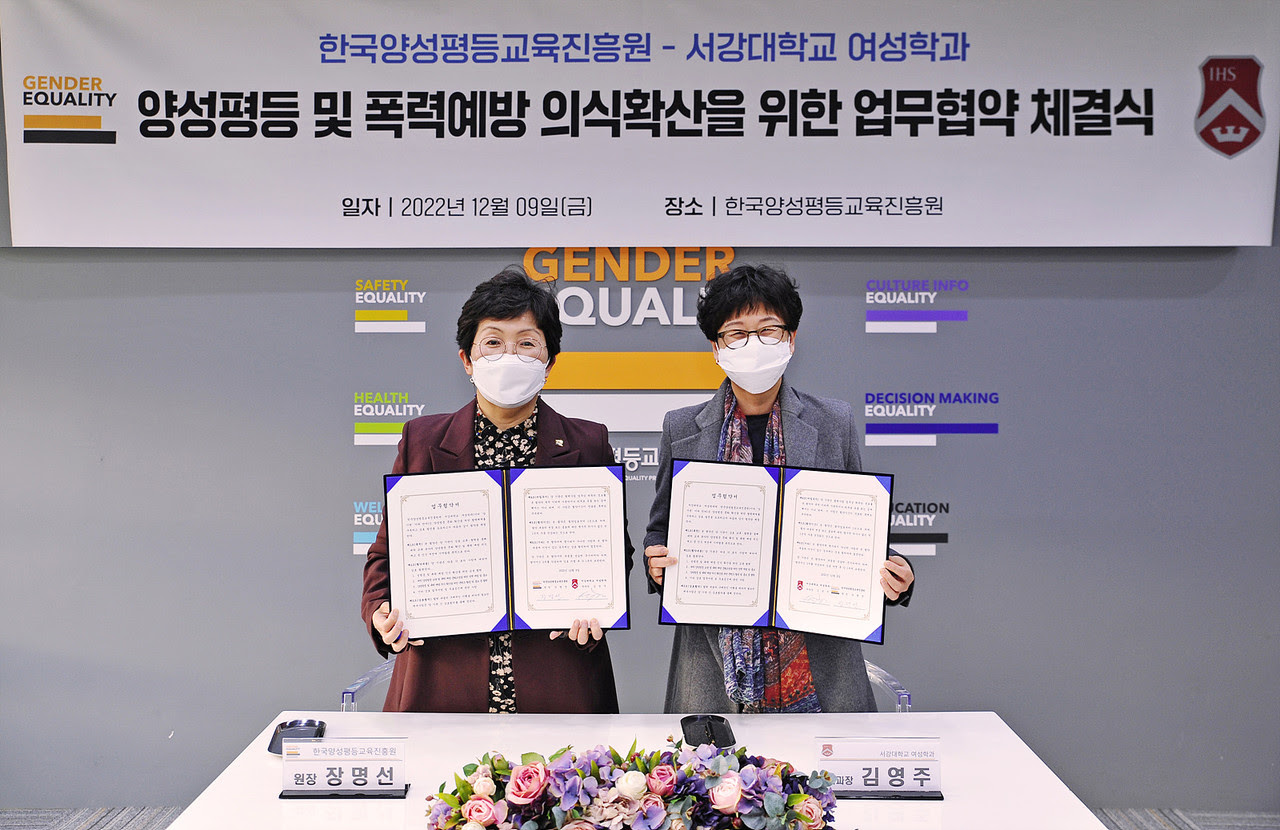 여성가족부 산하 한국양성평등교육진흥원이 서강대학교 여성학과와 젠더기반 폭력예방 의식 확산을 위해 업무협약을 체결했다.